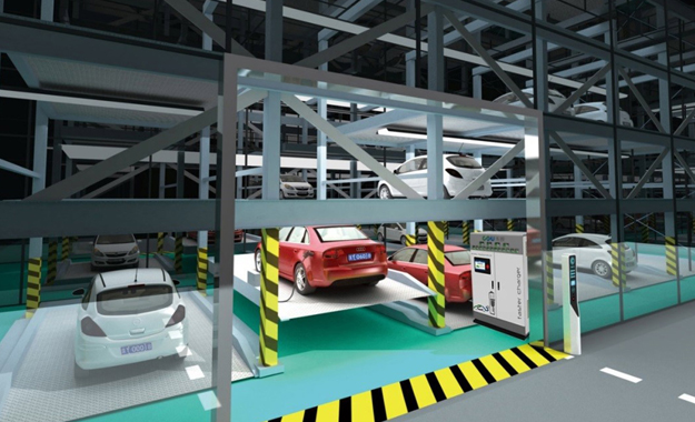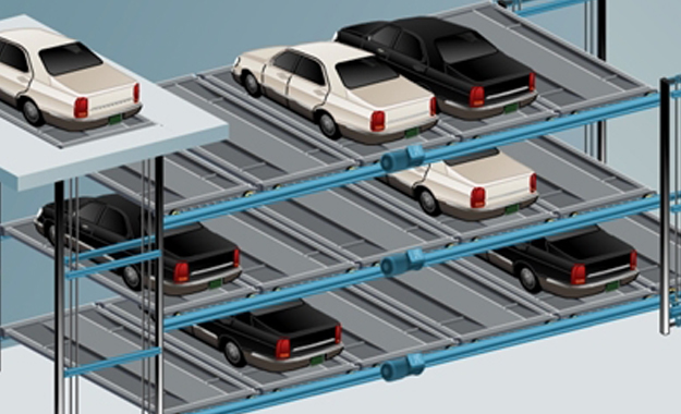 多層循環(huán)類立體車庫通過載車板左右移動和上下移動的相互配合使載車板循環(huán)運動,從而實現(xiàn)車輛多層存放。